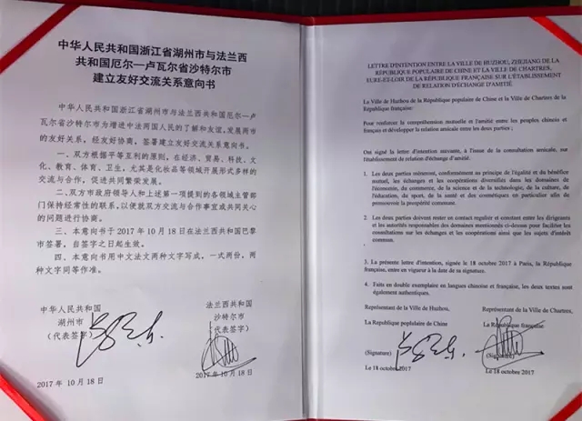 ➤中国湖州市与法国沙特尔市签订建立友好交流关系意向书