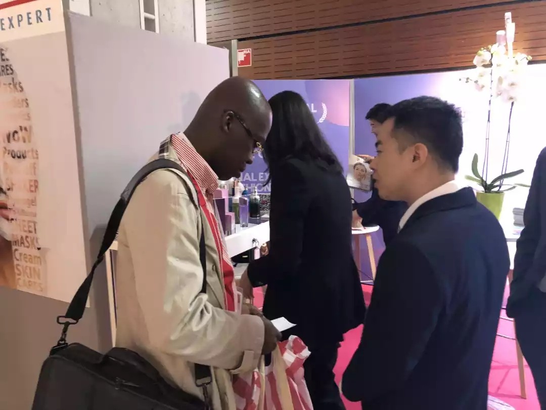 上图:法国沙特尔市市委书记Jean Pierre Gorge(中间)在展会中体验美妆小镇入驻企业生产的化妆品