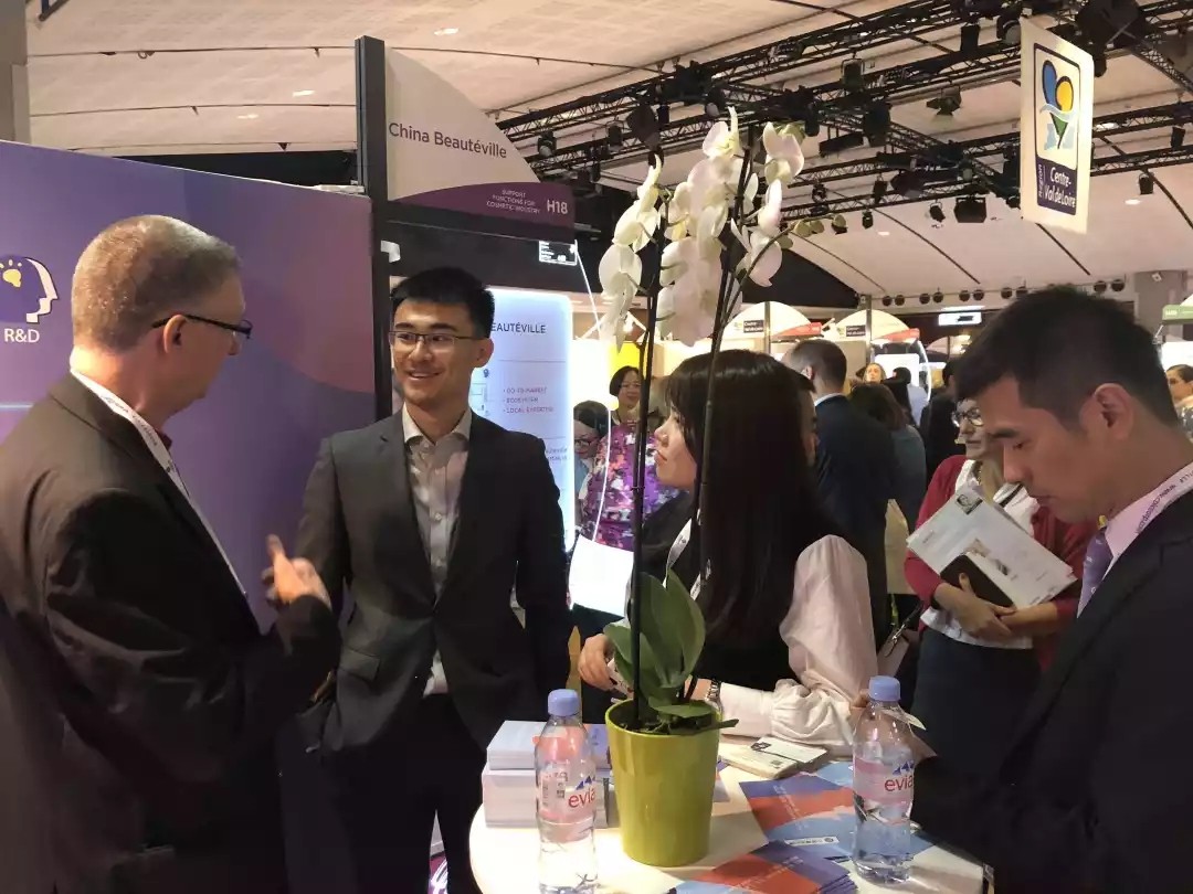 ➤中国美妆小镇代表团亮相法国Cosmetic-360展会:右三埭溪镇党委书记、美妆小镇管委会副主任潘鸣,左四中国美妆小镇总顾问侯军呈,右四法国化妆品谷创始人Jean Luc Ansel