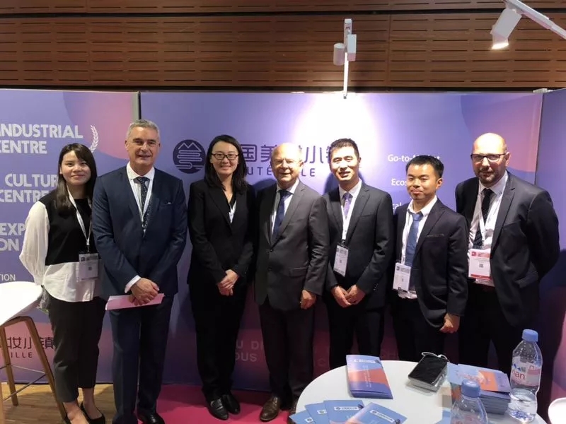 下图:法国沙特尔市市委书记Jean Pierre Gorge(中间)、法国沙特尔市常务副市长Didier Garnier(左二),沙特尔市经济顾问Mickaël Tachat(右一)在中国美妆小镇展位前与小镇招商团队共同合影