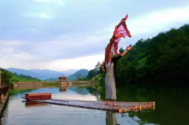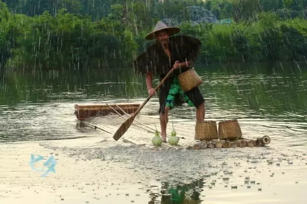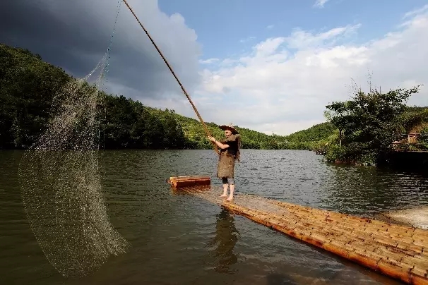 撑起木浆,远远地划过来,搅乱了这一湖碧水。 渔网被高高抛起,在阳光下晶莹闪烁。 而女子则立于竹筏之上,扬起手中的红纱巾,随风舞出最动人的弧度。