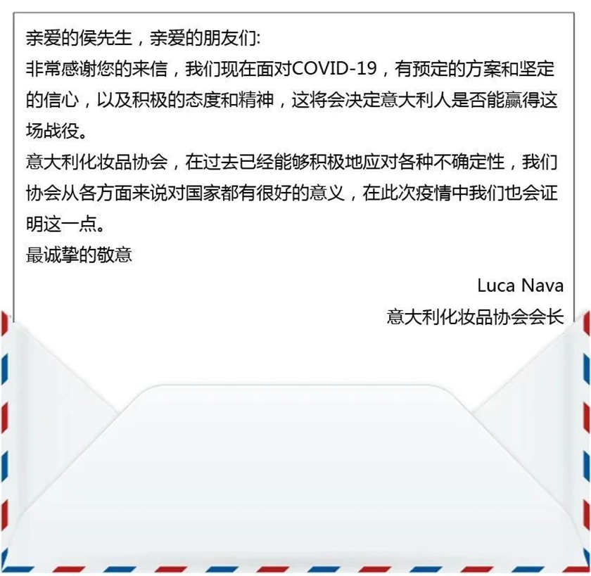 作为全球化妆品行业间的桥梁和纽带,中国美妆小镇在国内疫情逆转之际,听到海外合作伙伴求助的声音,积极筹备,以实际行动支援,尽一份绵薄之力。日前,美妆小镇已向意大利、法国、英国、澳洲、韩国、西班牙等地寄送了爱心支援口罩,也收到了来自各国合作伙伴的感谢和祝福。希望小镇驰援海外抗疫行动能给国外友人增强抗疫信心!