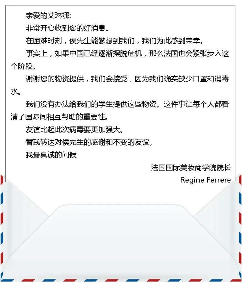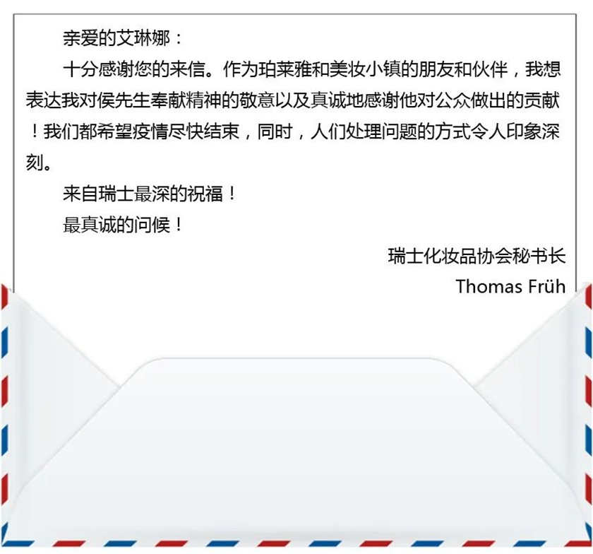 另外,作为您的长期合作伙伴,我们很愿意在最大程度上为您提供帮助。如果您有任何物资方面的需求,请直接向我们提出,我们一定全力以赴。在疫情爆发伊始,侯先生已经领导珀莱雅集团成立1500万人民币的疫情专项防控基金,这也是侯先生一直推崇社会奉献精神的体现。